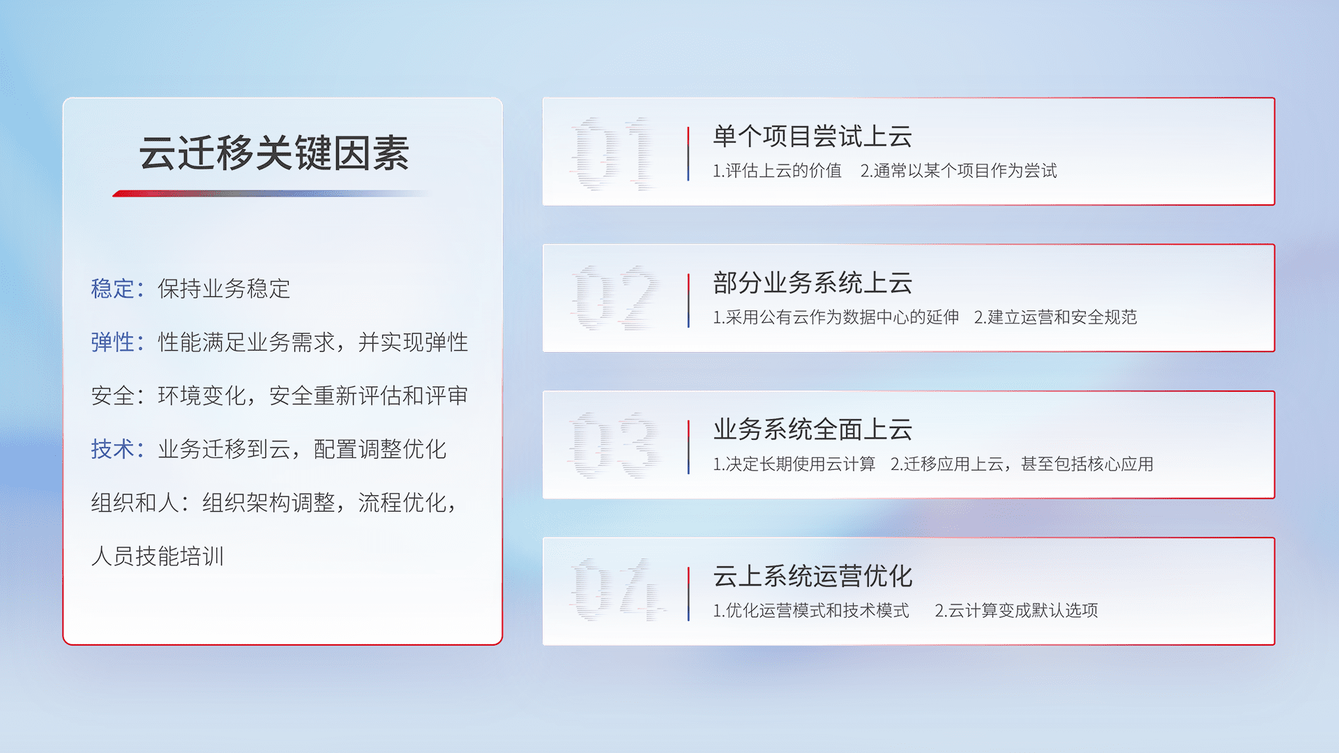 结合实际业务,,从规划设计、、、、云平台选型、、云原生改造、、、、数据迁移、、、集成交付,,,迁移全过程为客户识别最佳上云路径,,,,做好风险识别管理,,设计网络架构、、、、身份权限、、、、安全审计合规、、、、操作审计、、日志审计、、、、监控告警策略、、、、多站点容灾设计等,,,,对云上基础设施进行整体规划,,提升IT治理水平,,,,以满足弹性、、、、高可用、、、、高性能的需求。。。。