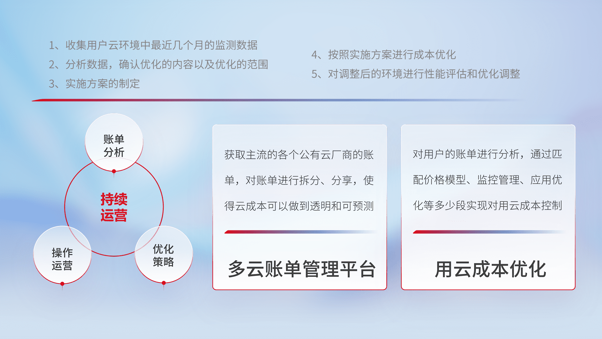 通过多云纳管,,,,以统一的资源数据模型把客户的云资源进行抽象和封装,,,进而实现对多云资源的统一操作,,,,保障云资源管理的可靠性、、稳定性与可用性。。。。量身定制化运维内容,,配置、、、、开发运维、、、、补丁管理、、备份、、监控、、、、认证和访问管理、、、、审计和日常巡检等,,,,保障在用云过程中的可靠度,,稳定度以及高可用率。。。